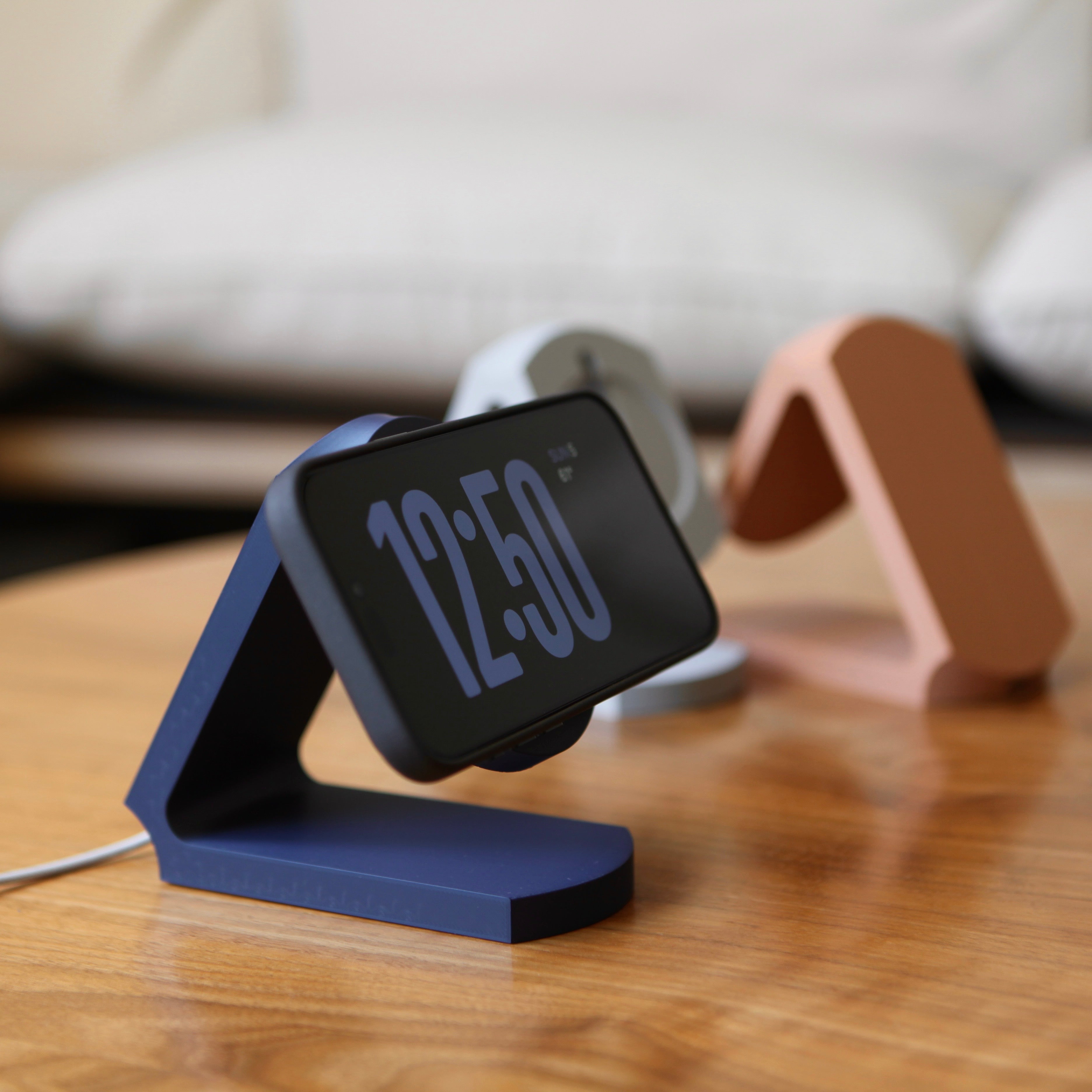 Elevate your workspace with the Nest MagSafe charger stand—a blend of minimal design and intuitive functionality. 3D printed with precision, its sculpted triangle silhouette blends curves and crisp edges to complement any decor. Whether on your desk, nightstand, or kitchen counter, Nest transforms charging into a statement piece. The perfect place to nest your phone.